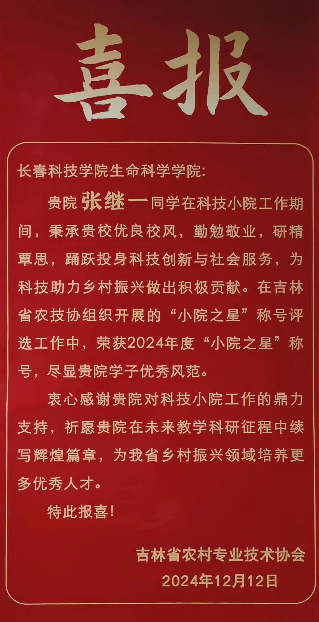 近日,“科技小院小院之星”评选结果正式揭晓,我院研究生张继一凭借在科技小院实践中的突出表现与扎实成果,成功斩获此项荣誉,为我院赢得荣光!